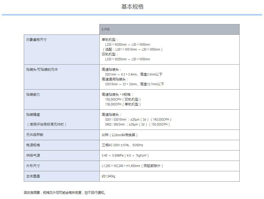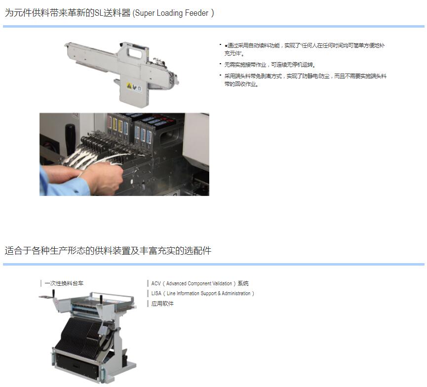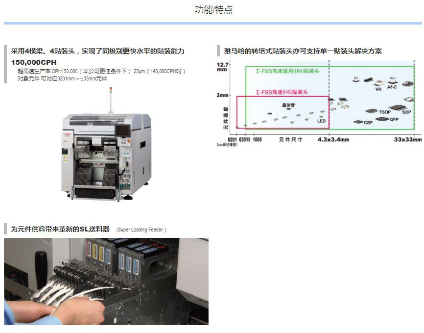 Σ-F8S 高端模塊貼片機(jī)1.轉(zhuǎn)塔式貼裝頭實(shí)現(xiàn)1臺(tái)貼裝頭支持貼裝多種元件,全面實(shí)現(xiàn)快速、通用、高運(yùn)轉(zhuǎn)率。2.以4梁、4臺(tái)貼裝頭實(shí)現(xiàn)同級(jí)快速150,000CPH。3.直驅(qū)式貼裝頭實(shí)現(xiàn)高速、高精度貼裝。4.SL送料器 (Super Loading Feeder) 開(kāi)拓補(bǔ)料作業(yè)新時(shí)代。