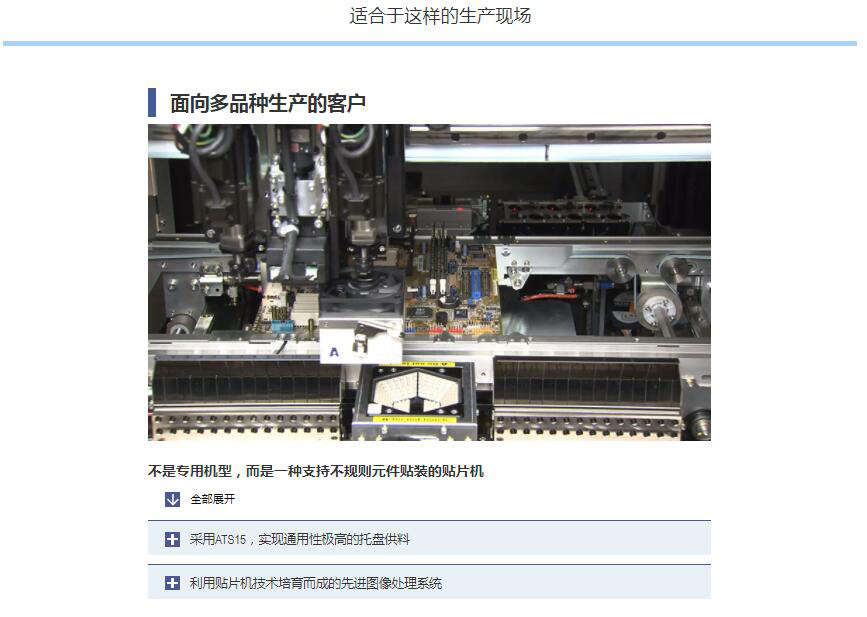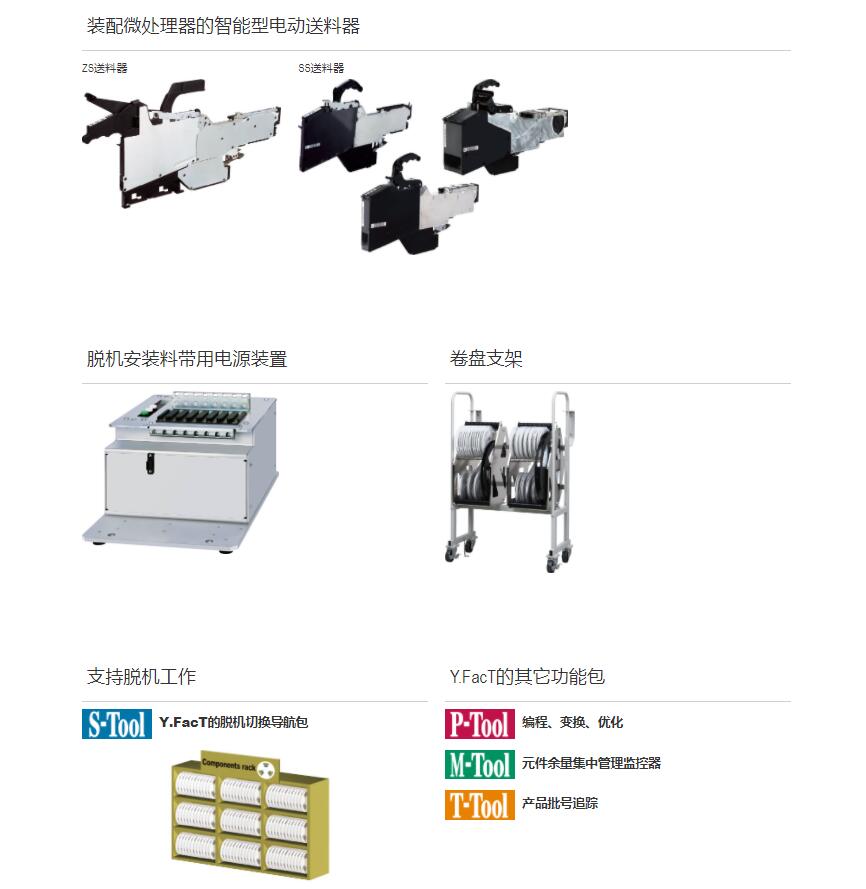 YC8 支持大型、不規(guī)則元件的小巧型模塊式貼片機(jī) 1.可貼裝較大尺寸達(dá)100mm×100mm、高達(dá)45mm的元件。2.支持貼裝重達(dá)1kg的元件,還具備壓入元件的功能。3.機(jī)身僅寬880mm的小型化設(shè)計(jì),可大限度地有效利用空間。4.支持可裝15張托盤的自動(dòng)更換式托盤供給裝置 ATS15。5.支持SS型電動(dòng)送料器與ZS型電動(dòng)送料器。