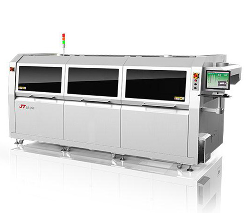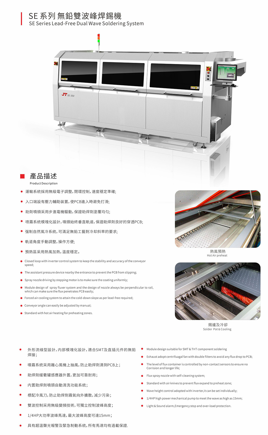 外形流線型設(shè)計,內(nèi)部模塊化設(shè)計,適合SMT及直插元件的無鉛焊接。 噴霧系統(tǒng)采用離心風機上抽風,防止助焊劑滴到PCB上。 助焊劑緩沖罐感應(yīng)器外置,更加可靠耐用。 標配冷風刀,防止助焊劑霧氣向外擴散,減少污染。 雙波控制采用無極變頻技術(shù),可獨立控制波峰高度。 1/4HP大功率波峰馬達,更大波峰高度可達15mm。 具有超溫聲光…
